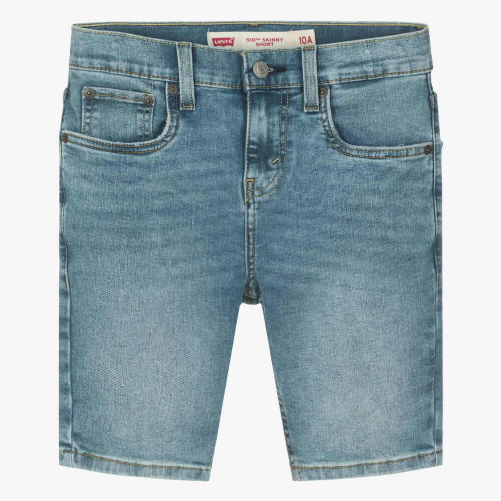 In a stylish skinny fit, these washed blue denim shorts for teen boys are by Levi's. For a distinctive designer look, they feature the brand's iconic Red Tab on the back pocket, with a 2-Horse logo patch above. Slim fitting through the hip and thigh, they have a slight stretch for comfort and finish just above the knee. With classic five-pocket styling, they fasten with a logo button and zip and have branded rivets to complete the look.