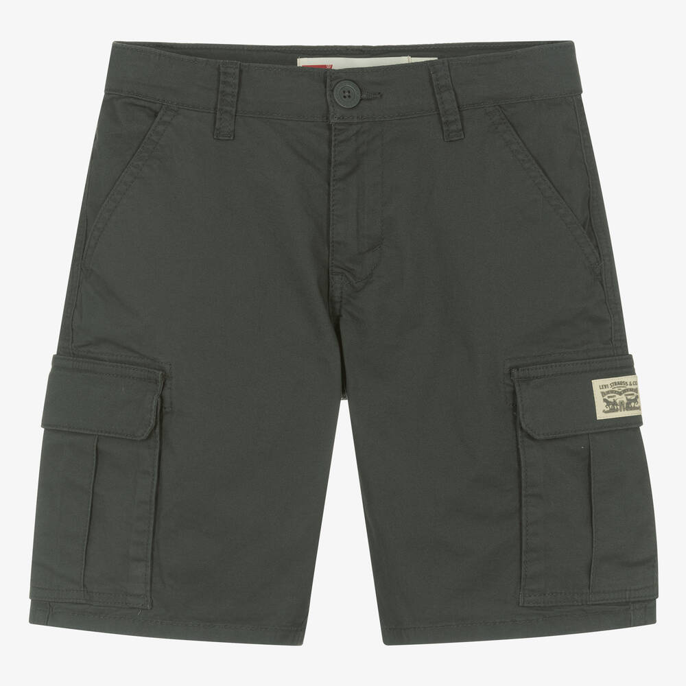 Charcoal grey cargo shorts for teen boys from American brand Levi's, signed with the famous 2-Horse patch and Red Tab logo. Cool and casual, they are designed in a relaxed fit from the hip through to the thigh, finishing above the knee. Enough to hold his small essentials, they have slanted pockets on the front, utility-style pockets with velcro to secure on the sides, and patch pockets on the back. The soft, slightly stretchy cotton twill fabric makes these lightweight shorts a great choice for warm-weather wear. They fasten with a button and zip on the front.