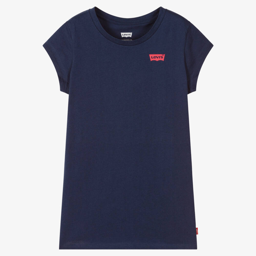 Casual navy blue cotton T-shirt for teen girls by iconic American brand Levi's. The front is printed with the brand's instantly recognisable Batwing logo in red, and the signature Red Tab is on one side seam, adding designer appeal to this wardrobe basic. It is made in soft, comfortable jersey for relaxed days and has pretty capped sleeves.