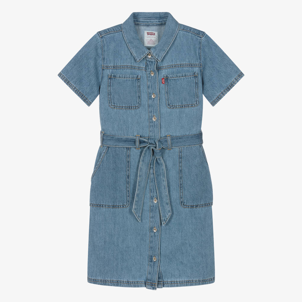 Cool and casual for teen girls, a mid-wash blue denim dress by Levi's. It has a pointed collar, short sleeves and silver tone branded front button fastenings. This trendy utility style has two patch pockets on the bodice, two larger pockets on the skirt, and comes with a detachable sash belt. The iconic Red Tab is sewn on the chest for a finishing designer touch.