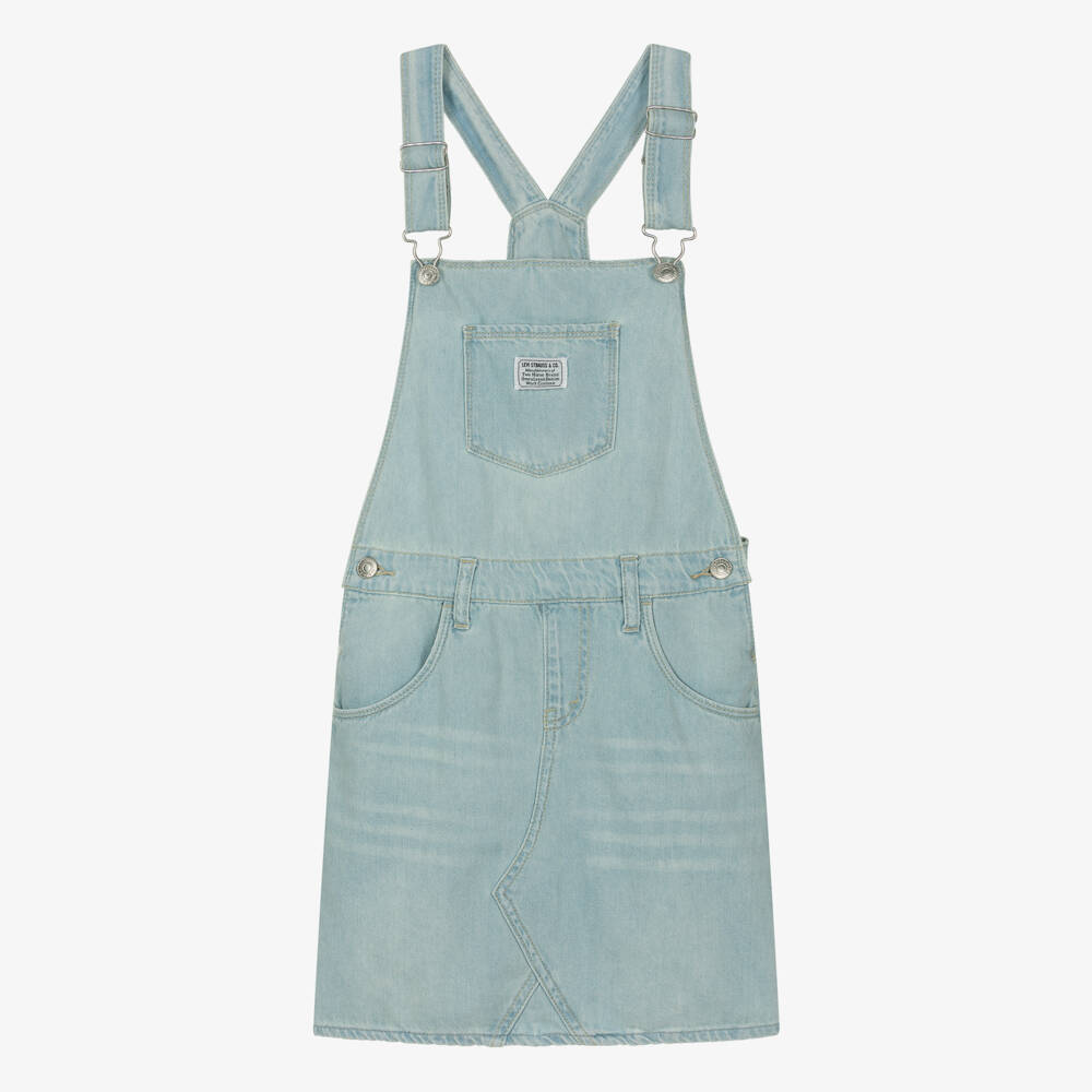 A light blue dungaree dress for teen girls by American brand Levi's, with a branded logo patch on the chest pocket. The sun-bleached fabric is made in non-stretch cotton denim with topstitching details. There are branded button fastenings on each side and metal slider buckles on the shoulder straps to adjust with ease. A Red Tab can be seen on the back pocket for a signature touch.