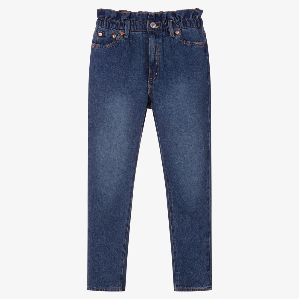 Teen girls blue high-loose jeans from Levi's, made from mid-weight cotton denim with a worn look. A vintage-inspired style, with waist-emphasising high rise and relaxed wide legs, but slim through the hip and thigh. This five-pocket design has an elasticated paper bag waistband and fastens with a zip and button on the front. They have a brown 2-Horse logo patch and a Red Tab logo on the back.