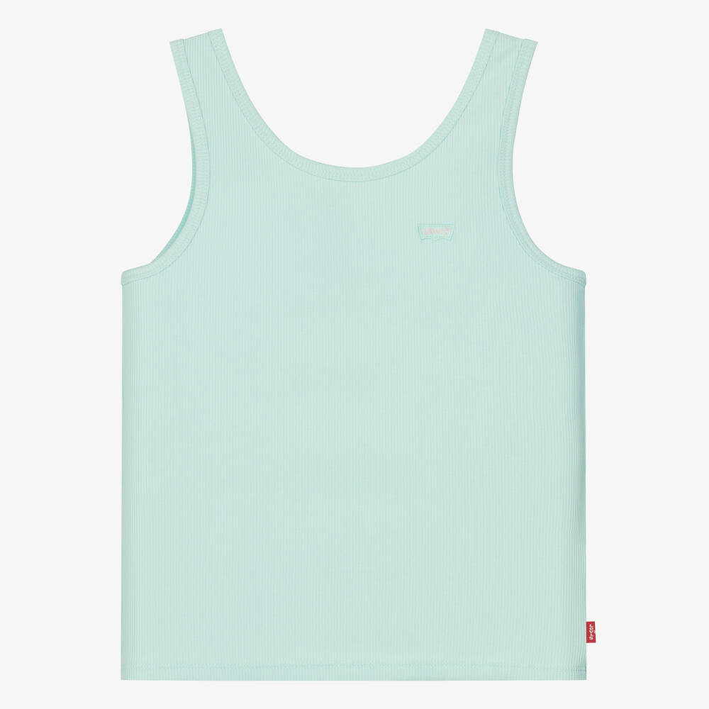 A ribbed jersey sleeveless top for teen girls by Levi's, in a cool shade of pale turquoise green. This casual vest top is made in a comfortable cotton blend, with a small Batwing logo patch in pink and tonal green on the chest. Adding a finishing designer touch, the iconic Red Tab is sewn at the side seam.