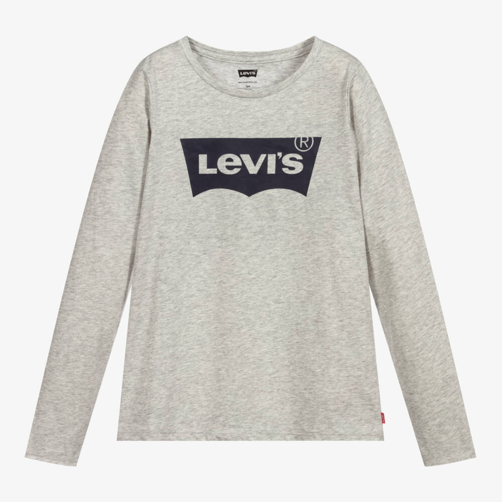 Teen girls grey marl long-sleeved top by Levi's. Ideal for casual days, it has the iconic Batwing logo print on the chest in navy blue with the signature logo tab on one side seam. Comfortable to wear, it is made in a lightweight, stretchy cotton blend jersey