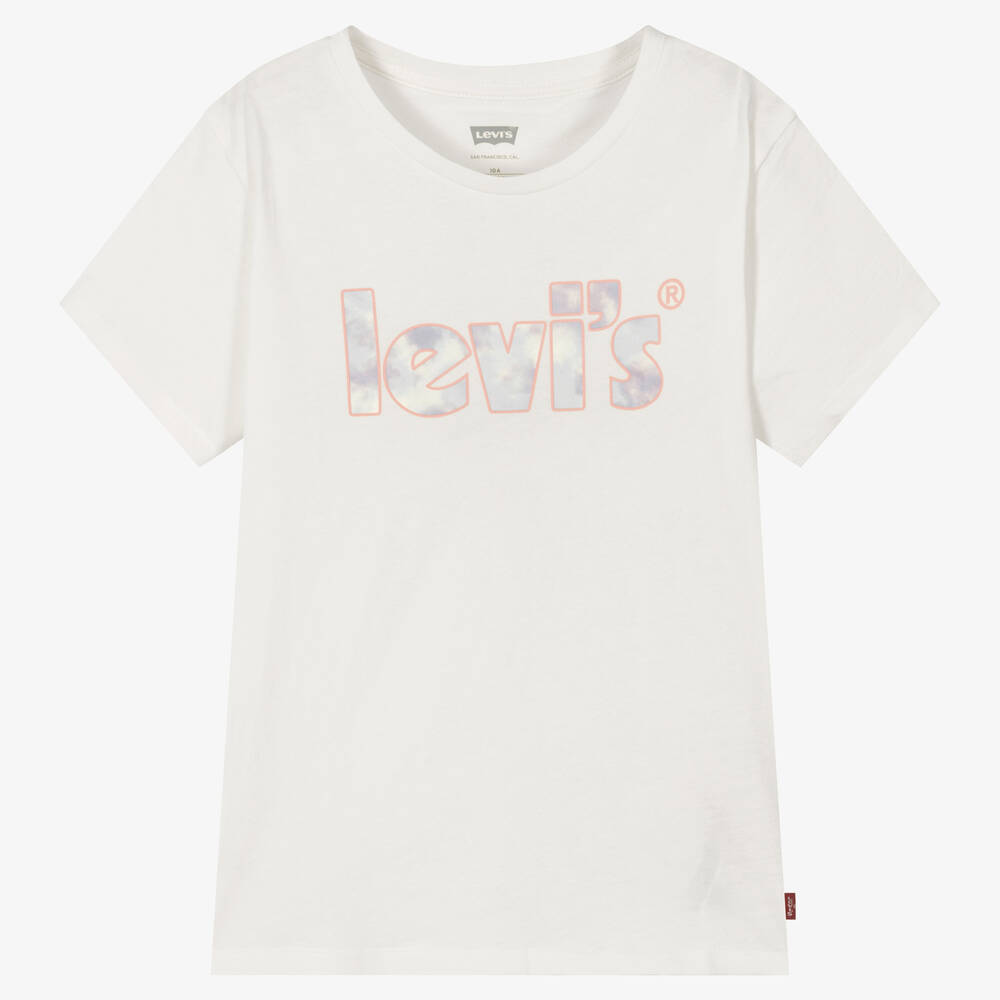 White organic cotton T-shirt for teen girls by iconic American brand Levi's. Made in comfortable jersey for casual days, it has a tie-dye logo print on the front in pale blue and pink, with the designer's signature Red Tab on one side seam.