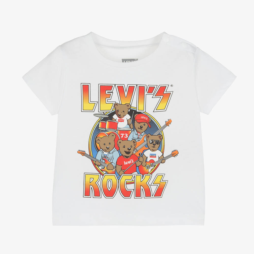 Fun white cotton T-shirt for little boys and girls by iconic American brand Levi's. Made in comfortable jersey for casual days, it has a colourful, teddy bear rock and roll band printed on the front with 'Levi's Rocks'. It has useful popper fastenings on one shoulder for speedy dressing.