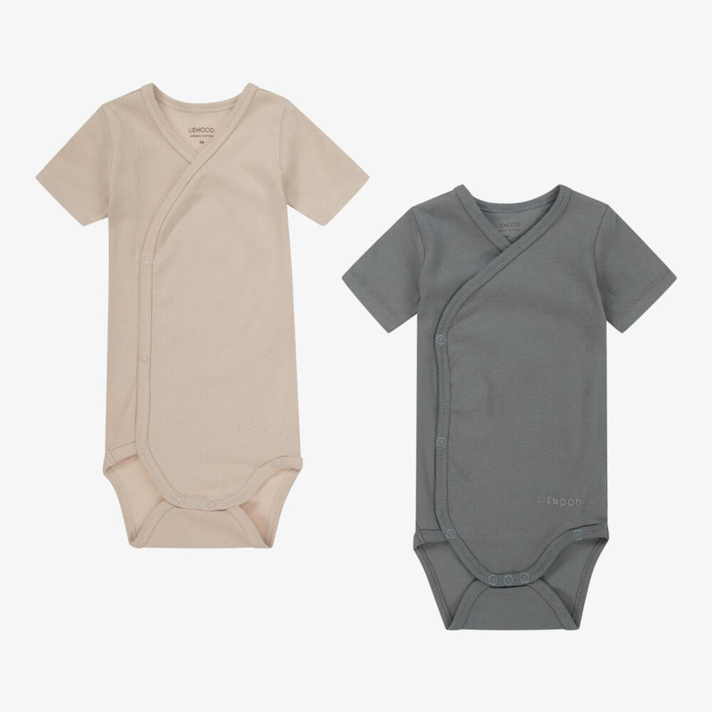 Baby girls and boys blue and beige bodyvests by Liewood, made in ribbed organic cotton jersey. In a cross-over style, they have poppers on the front and between the legs. The designer's name is in tone-on-tone embroidery on the front.