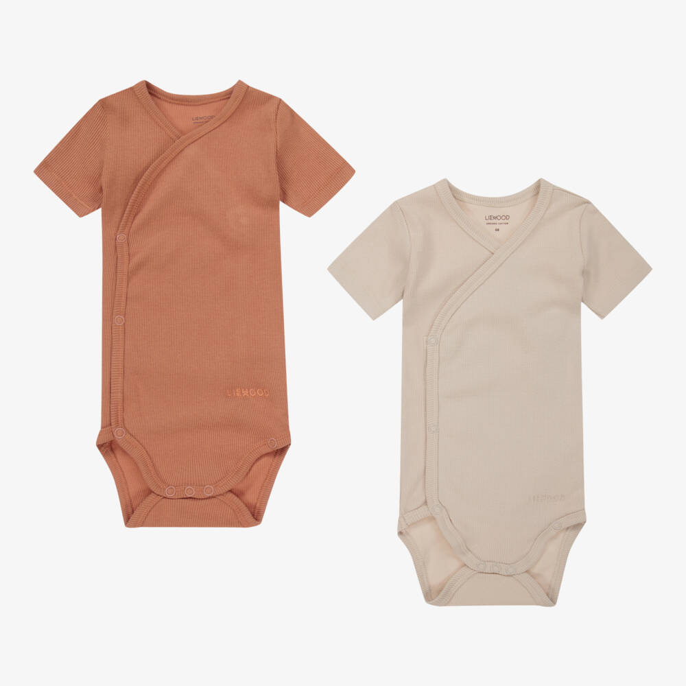 Baby girls pink and beige bodyvests by Liewood, made in ribbed organic cotton jersey. In a cross-over style, they have poppers on the front and between the legs. The designer's name is in tone-on-tone embroidery on the front.