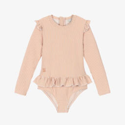 Peppermint green and ivory swimsuit for baby girls by Liewood, made in soft and stretchy seersucker. This simple design has long sleeves for added coverage with cute ruffle details on the shoulders and waist. The body is comfortably lined and fastens with a zip on the back. Poppers between the legs are convenient for quick nappy changes.