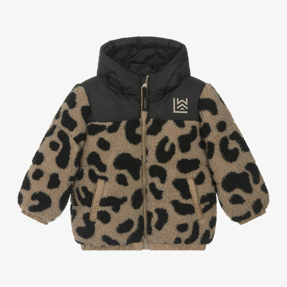 Cosy, beige and black hooded jacket for boys and girls by Danish brand Liewood, made in soft, thick sherpa fleece. Warmly padded, it has water-repellent, ripstop fabric on the shoulders, hood and trims, and a silky, black lining. The front zip fastening has a protective chin guard, and the jacket has fleece-lined pockets and elasticated trims, ideal for colder days. Adding a discreet branded touch, there is a logo print on the chest.
