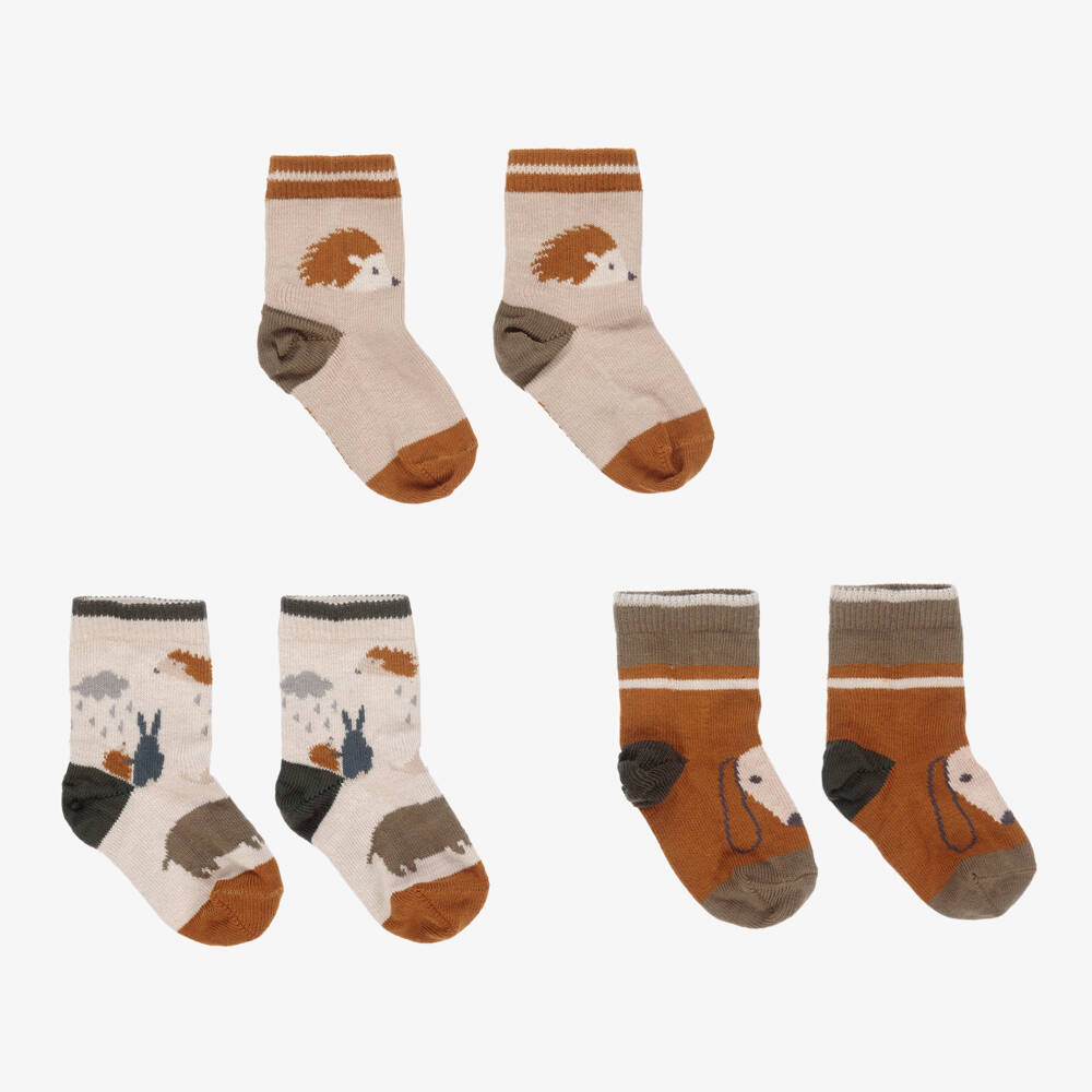 Pack of three pairs of cotton rich socks for boys and girls by Liewood. In shades of beige, brown and khaki green, they are patterned with cute animals.