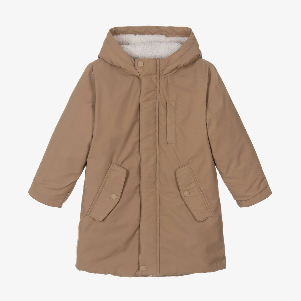 Beige parka coat for boys and girls by Danish brand, Liewood. Lined in soft sherpa fleece for warmth, it has a water repellent coating for extra protection on rainy days. Made using recycled materials, this practical coat has fleece-lined pockets to keep hands extra cosy. Simple and minimalist, it fastens with poppers and a concealed zip on the front.