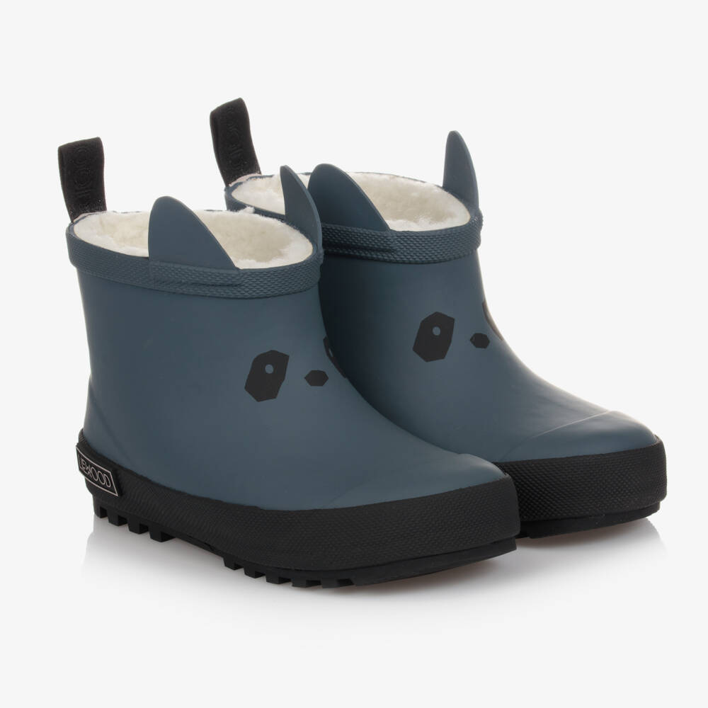 Dark blue rain boots by Liewood for boys and girls. Made from natural rubber, these super cute boots have panda face features and are designed to be durable and long-lasting. Slip-resistant on both wet and dry surfaces, they have a flexible sole to prevent splitting. They are fully lined in cosy synthetic teddy fleece down the shaft and inner sole to the toes.