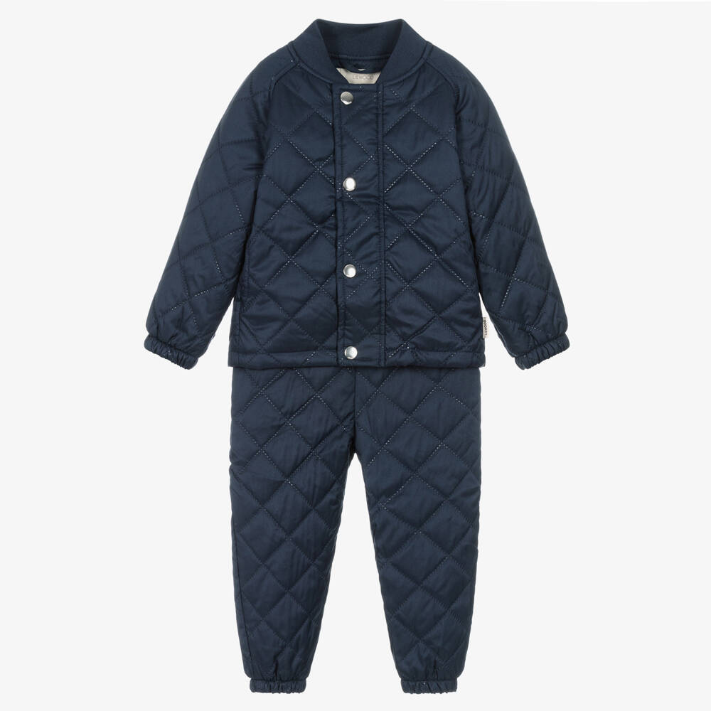 Ideal for outdoor adventures, this navy blue thermal jacket and trouser set for younger boys and girls is from Danish brand, Liewood. It is made, lined and padded in recycled polyester that is water-resistant, wind-resistant and breathable for comfort. Soft, durable and lightweight, both pieces have a smart quilted diamond pattern. Fastening with a zip beneath a branded popper flap, the jacket has a ribbed collar, elasticated cuffs and useful front pockets. The trousers have elasticated trims and an adjustable waist for a comfortable fit.