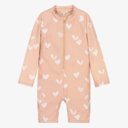Blue and white striped sun suit for little boys and girls by Liewood. Made in soft, stretchy seersucker, it is fully lined with a stand-up collar and elbow-length sleeves. The design includes a practical front zip for easy dressing.