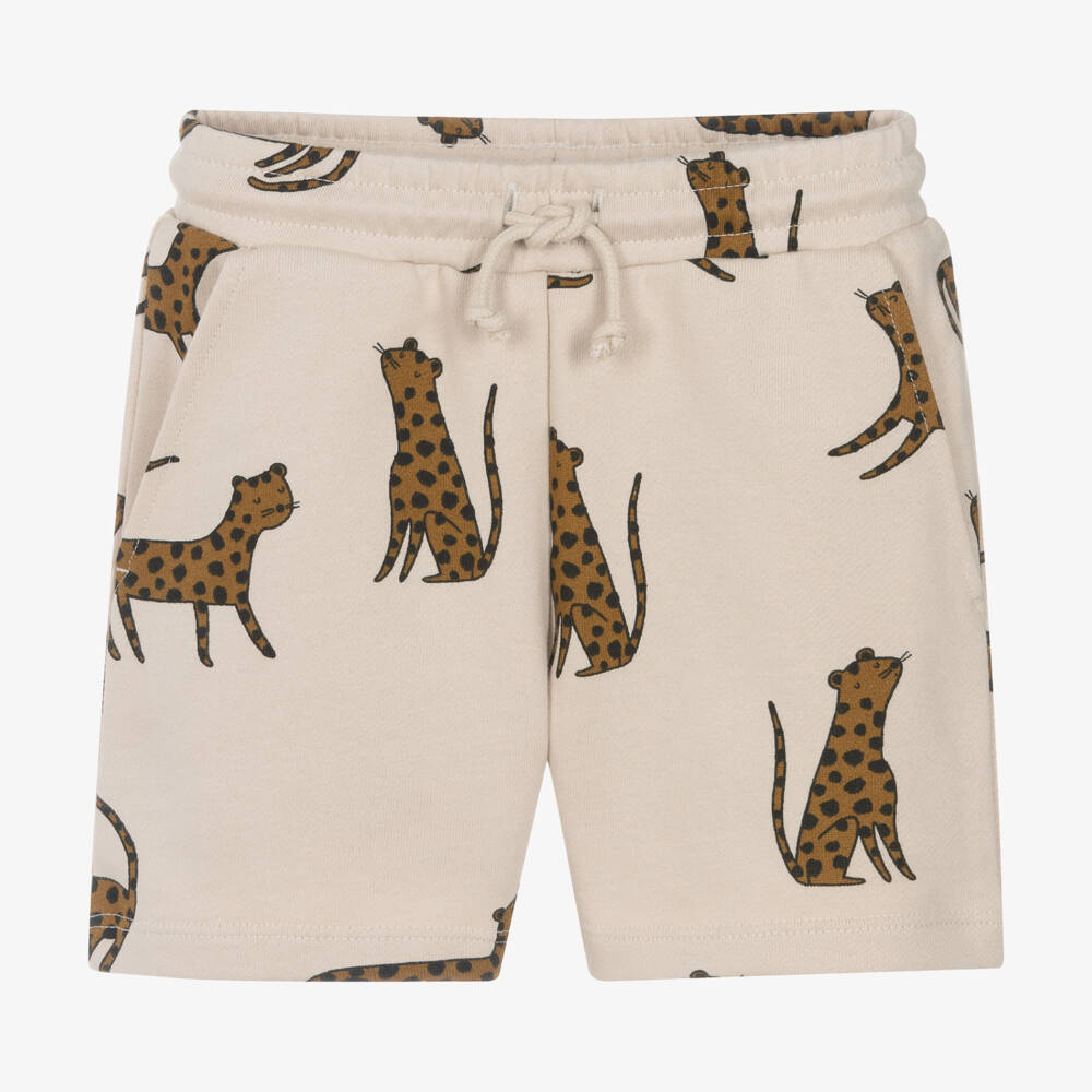 Comfortable and casual beige shorts for boys from Danish brand Liewood, made in soft organic cotton sweatshirt jersey. They are patterned with adorable brown and black leopard graphics for added fun. There are side pockets on the front and an elasticated waistband with a drawstring for an adjustable fit.