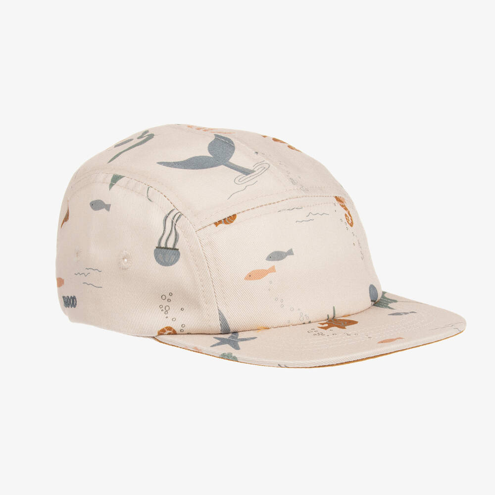 A light beige cap for boys by Danish designer Liewood, made in soft organic cotton twill. With an adjustable buckle on the back, this playful accessory is patterned in a fun sea creature print in shades of blue and dark beige. An embroidered logo can be seen on one side for an added designer detail.