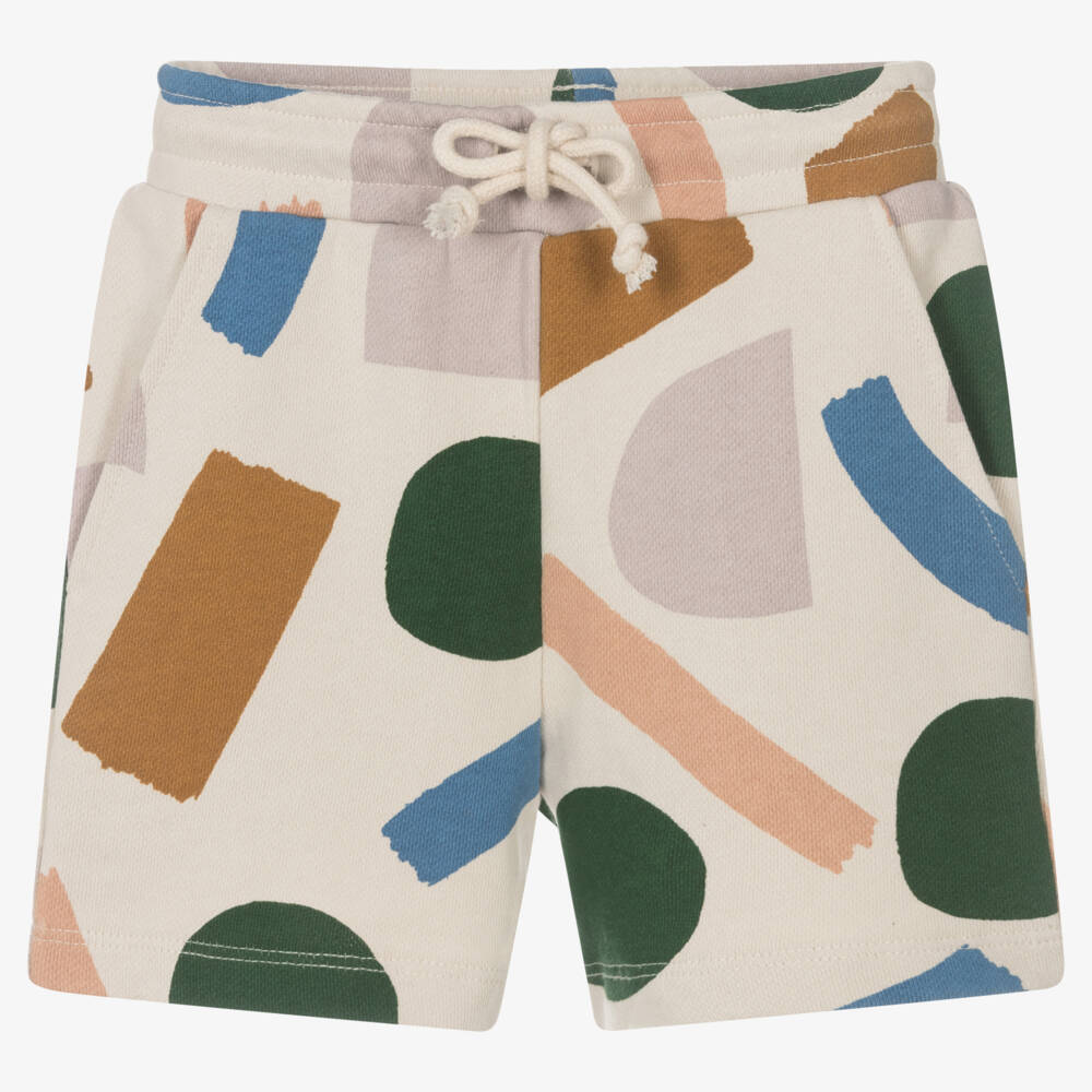 Light beige organic cotton shorts for boys from Danish brand Liewood. They are made in stretchy and comfortable sweatshirt jersey with an abstract paint stroke design in blue, green and brown. The elasticated waist has a drawstring for a great fit, and there are handy front pockets for storing essentials.