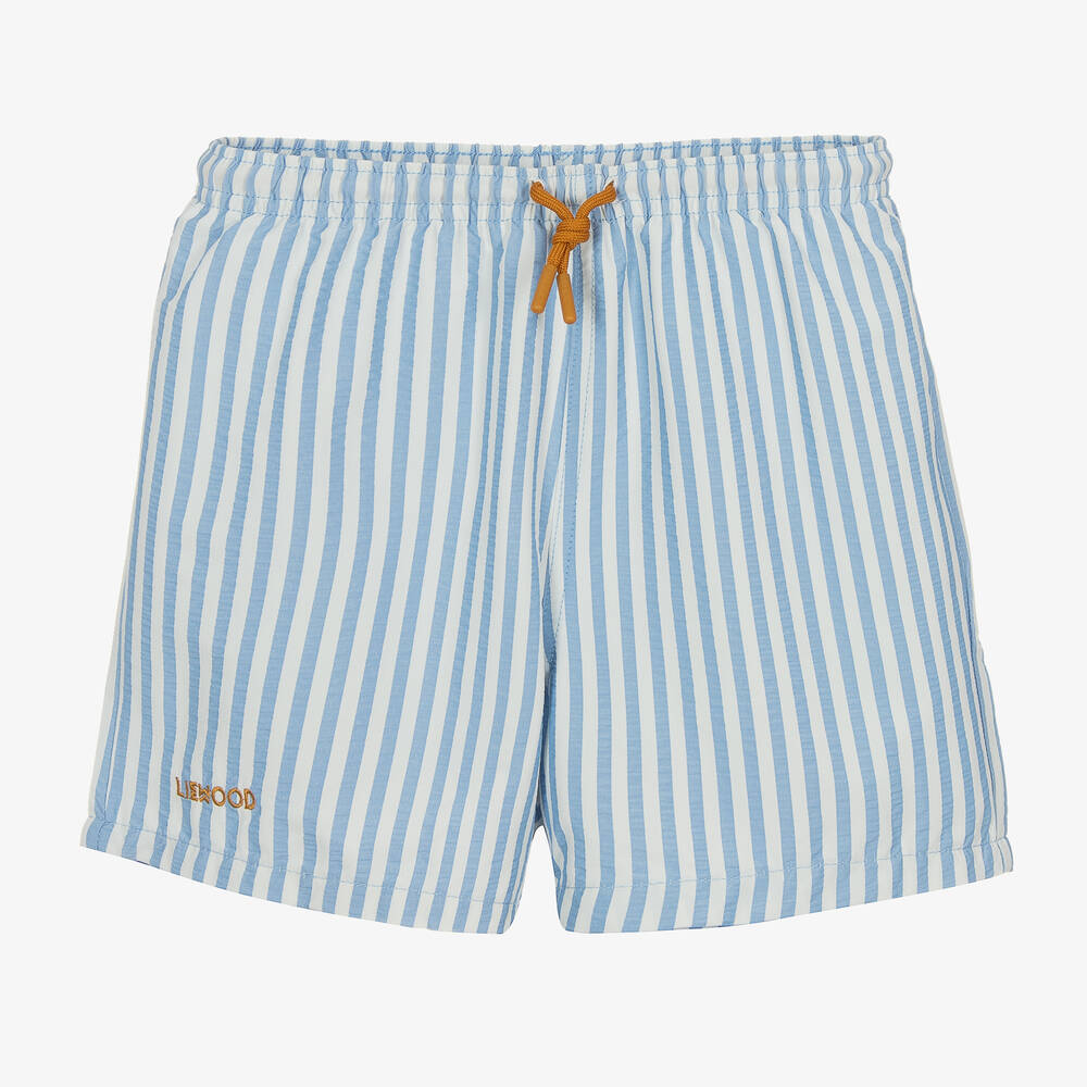 Light blue and off-white swim shorts for boys by Danish brand Liewood, made in lightly textured fabric with UPF 40+. Containing recycled fibres, these lightweight shorts have a vertical stripe design with the brand's name embroidered on one leg in mustard yellow. This matches with the drawstring ties on the waist. They are finished with a soft mesh lining for comfortable wear in the water.