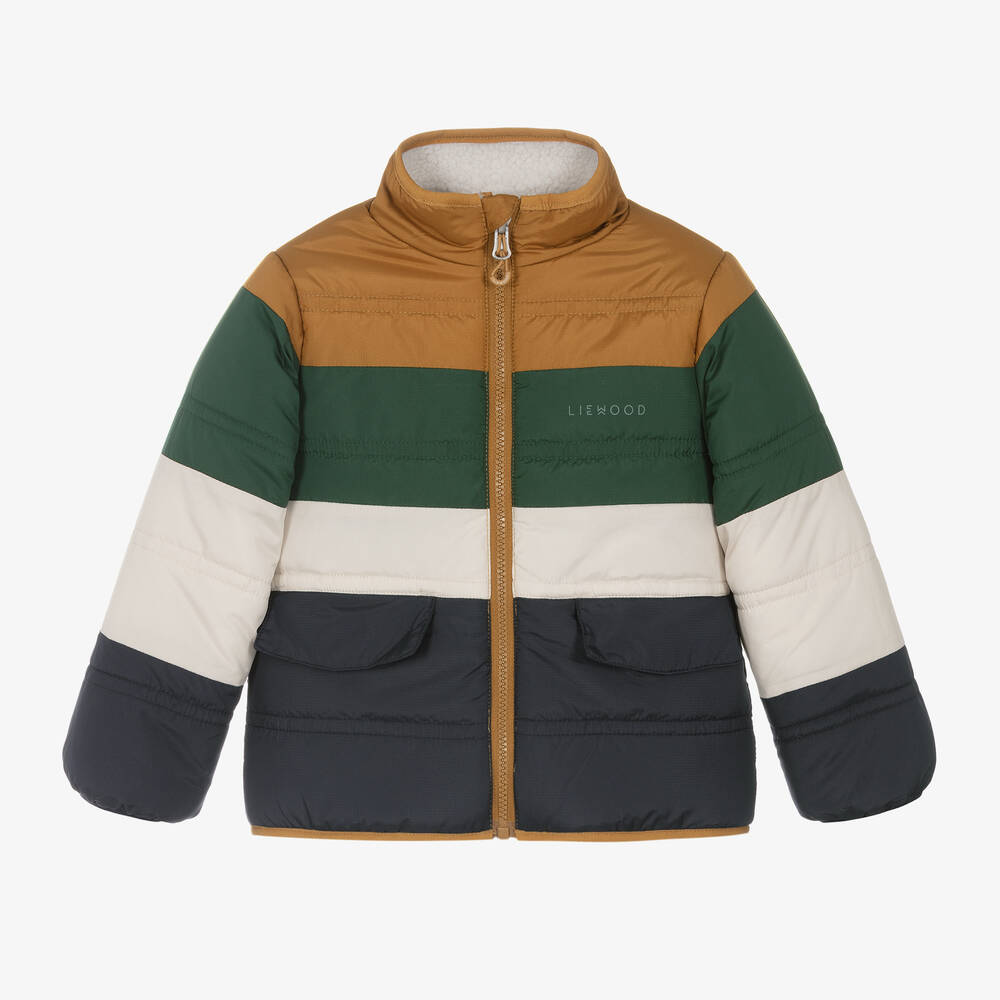Boys reversible colourblock puffer jacket by Liewood, in a navy blue, green and mustard yellow design. Warmly padded, one side is water-repellent, whilst the reverse is made from soft, ivory sherpa fleece. Subtle branding can be seen on both sides, along with useful pockets. It has a high collar and gently elasticated trims and fastens with a branded zip on the front