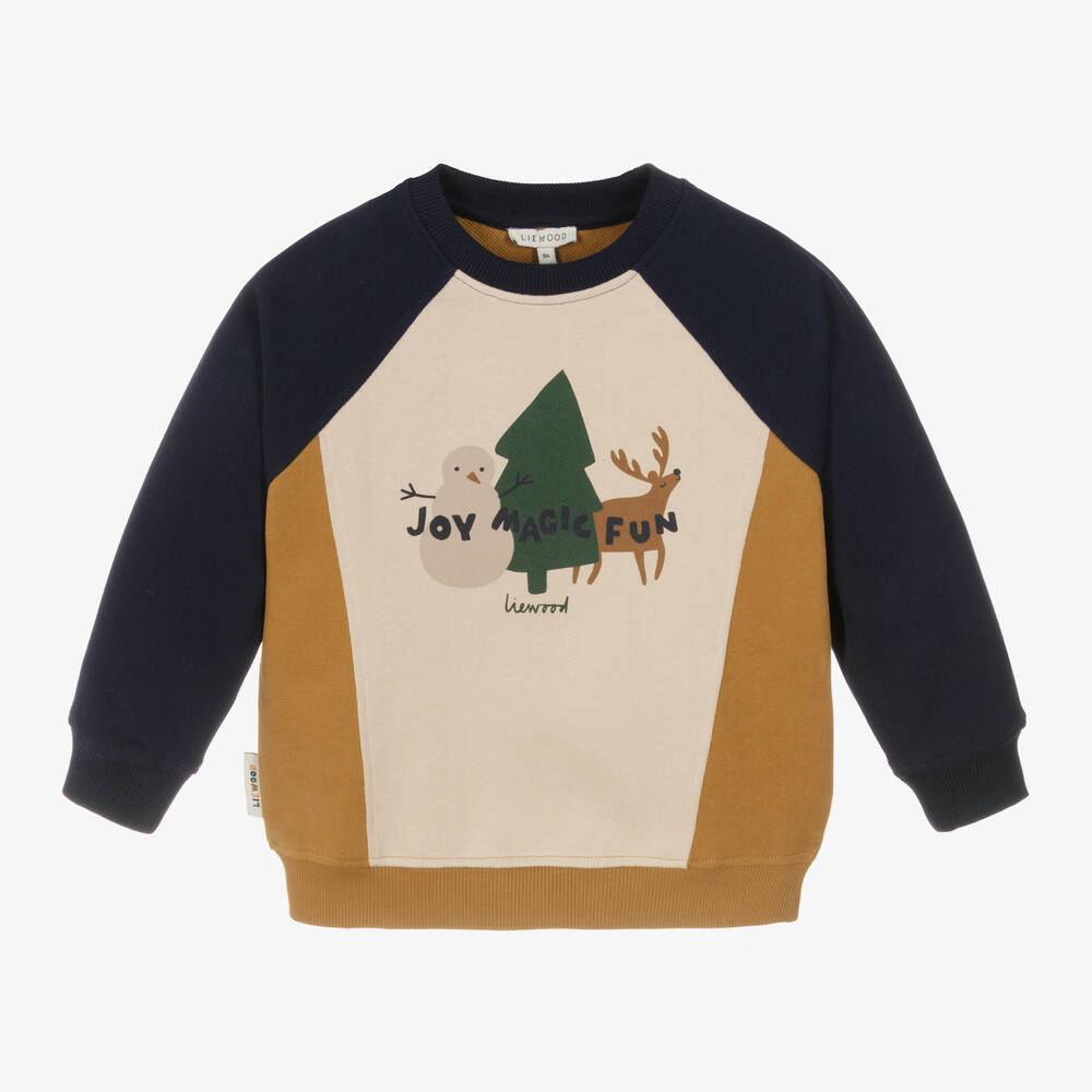 Super cute festive organic cotton sweatshirt for boys and girls by Liewood, with a Christmas tree, snowman and reindeer print on the front. Colourblocked tan brown, navy blue and ivory, it is made in soft, comfortable jersey.
