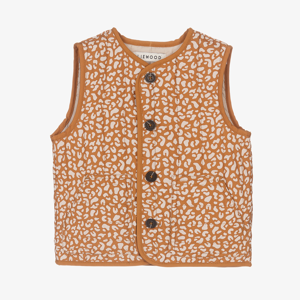 Caramel brown quilted gilet for boys and girls by Danish brand Liewood, with a beige leopard print. Made in organic cotton, the beige lining and light padding are made from recycled polyester. It has button fastenings on the front with useful patch pockets.