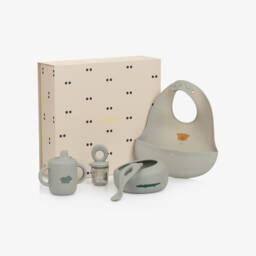 This blue mealtime set by Liewood brings together a collection of essential feeding accessories for baby boys. Made from durable, food-safe silicone, the set includes a sturdy bowl with a suction base, an easy-to-hold spoon, a sippy cup, a food feeder and an adjustable bib with a handy catch pocket. Each piece features a charming animal motif, adding a playful touch to mealtime.