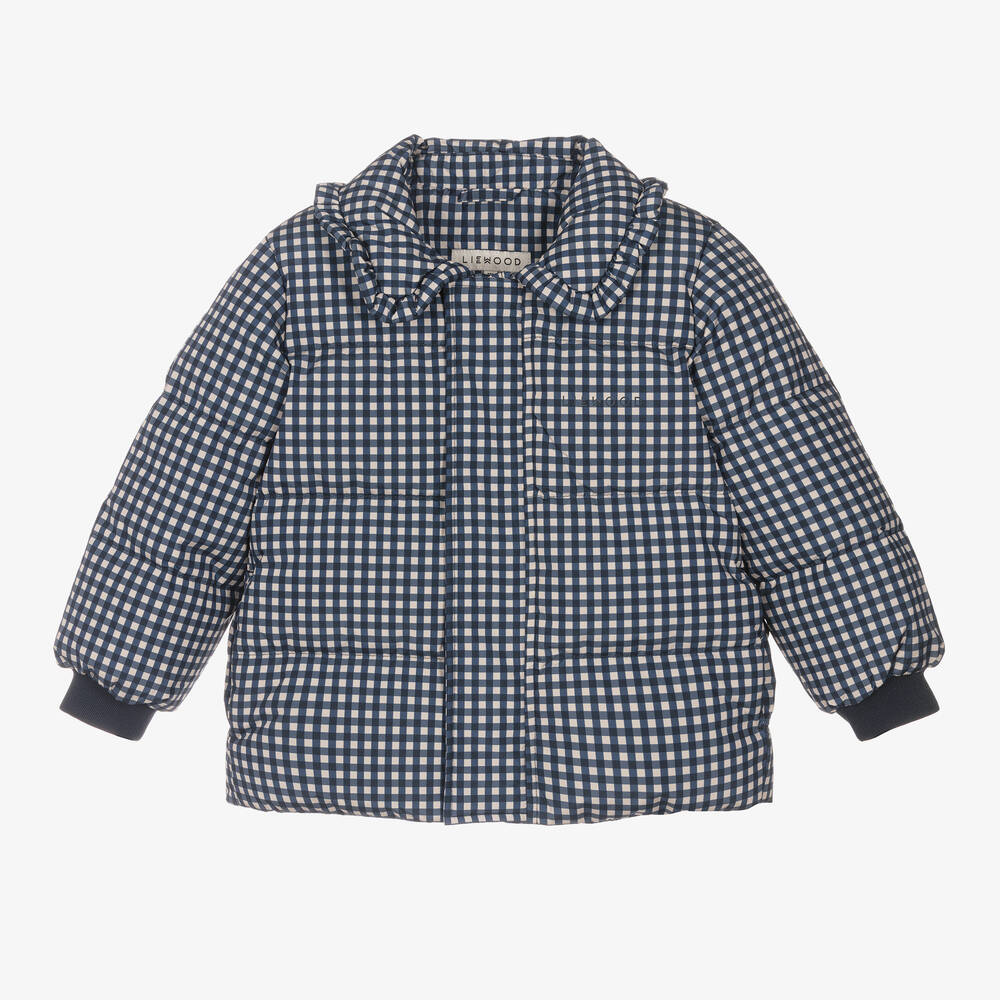 Cosy navy blue and ivory gingham check coat for girls by Liewood, warmly padded with luxurious down. Ideal for chilly, rainy days, it has ribbed cuffs and a popper-fastening flap over the front zip, which has a protective chin guard. The padded collar has a pretty frill and a subtle logo is printed on the chest. There are useful pockets on the side seams and a satin lining for comfort.