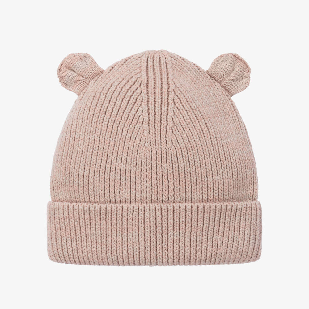 Light rose pink hat for younger girls by Danish brand Liewood, in a warm and cosy ribbed knit. A cute accessory for the cooler months, it has a turned-up brim with fun 3D knitted ears on the top. A little logo label is sewn on the back for a discreet designer detail.