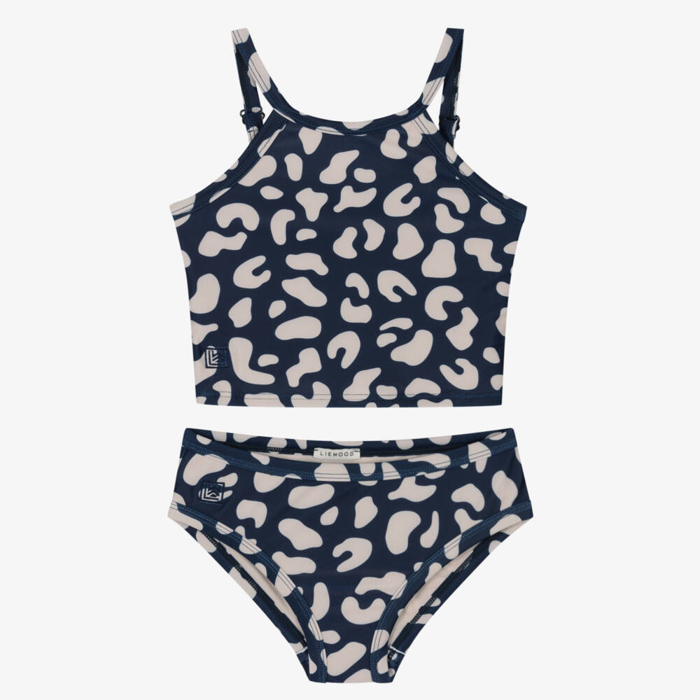A navy blue tankini for girls by Danish brand Liewood, made in a smooth and stretchy recycled fabric. This tankini is patterned in a beige leopard print design, with a tonal logo embroidered for minimalistic styling. With UPF40+, the long-length top offers to cover and protect delicate skin from the sun. The shoulder straps are adjustable, and both items are fully lined for comfort.