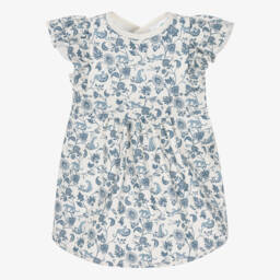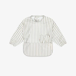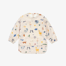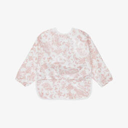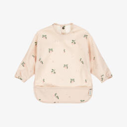 Dusky pink apron bib for little girls by Liewood, printed with a sweet blackberry pattern. This practical design is made in water-repellent, easy clean fabric, with a useful pocket to catch spills and crumbs, and long sleeves with elasticated cuffs. Playful ruffles on the shoulder add a pretty touch and the bib fastens with poppers on the back.