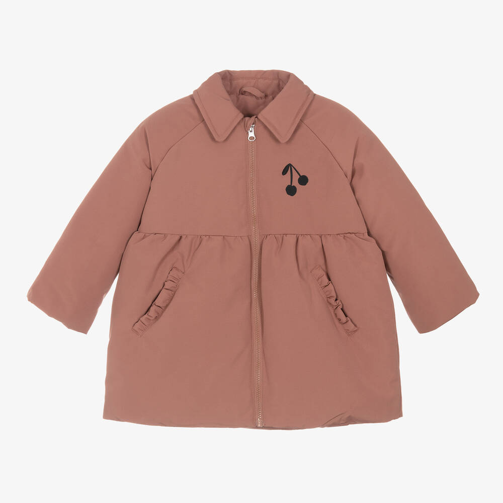 Cosy dusky pink coat for girls by Liewood. Ideal for the chilly months, this warmly padded style has fleece-lined, frill-trimmed pockets and a sturdy zip with a protective chin guard. The coat has sweet black cherries embroidered on one side, and a comfortable satin lining with a beige and black animal print.