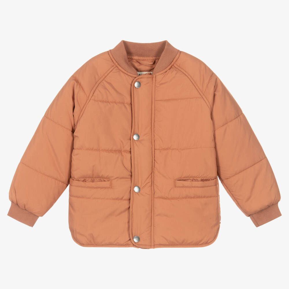 In lovely sunset pink, a lightly padded jacket for girls by Danish brand Liewood. This practical, everyday jacket is wind resistant with a BIONIC-FINISH® ECO water-repellent finish and secures with a zip under a popper fastening flap. Made from smooth recycled polyester, it has ribbed trims, handy front pockets, a name tag on the inside and an ivory logo patch on the back.