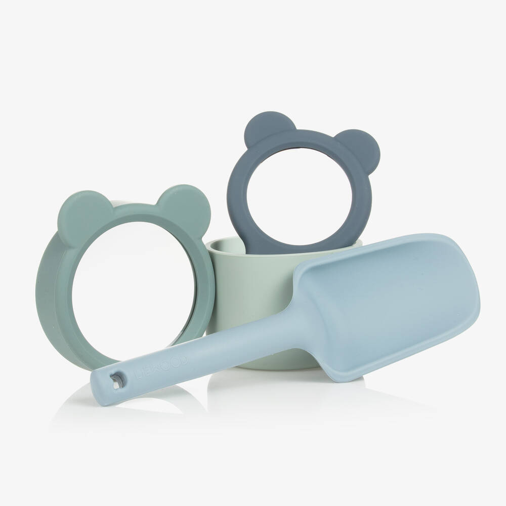 Fun green and blue exploration toy set for boys and girls by Danish brand Liewood. Exciting and entertaining for curious little explorers, the set includes a little pot with a removable magnifying lid, a bear-shaped magnifying glass and a spade. All the pieces are made in soft and easy-to-clean silicone with acrylic magnifying glasses.