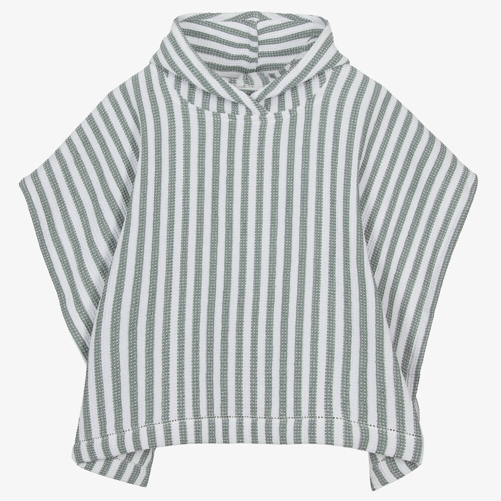 Green and white striped poncho towel for boys and girls by Liewood, woven in softly textured organic cotton. Ideal for days at the beach, this hooded design has a lightweight feel with a waffle texture. Great for coverage after a swim, this absorbent towel has open sides to allow younger ones to move with ease. There is a logo tab on one side to identify the brand.