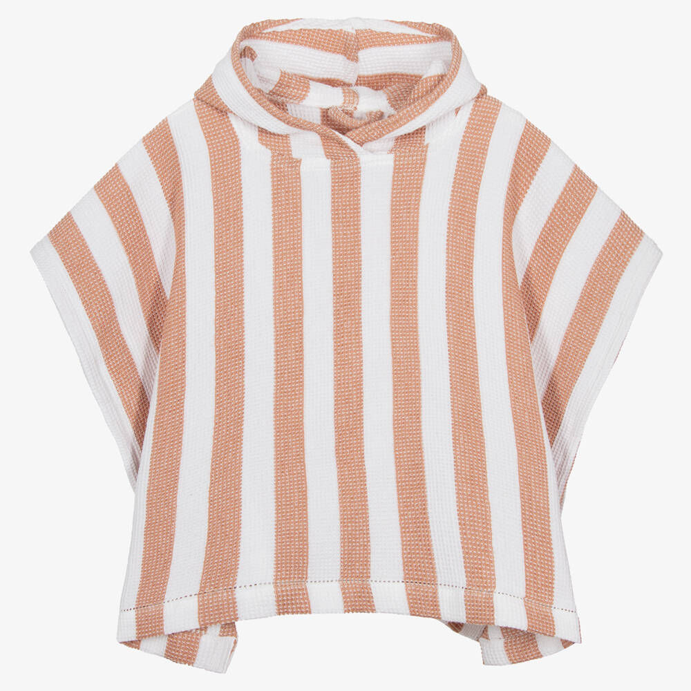 Terracotta pink and white striped poncho towel for girls by Liewood, woven in softly textured organic cotton. Ideal for days at the beach, this hooded design has a lightweight feel with a waffle texture. Great for coverage after a swim, this absorbent towel has open sides to allow younger ones to move with ease. There is a logo tab on one side to identify the brand.