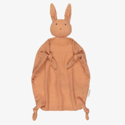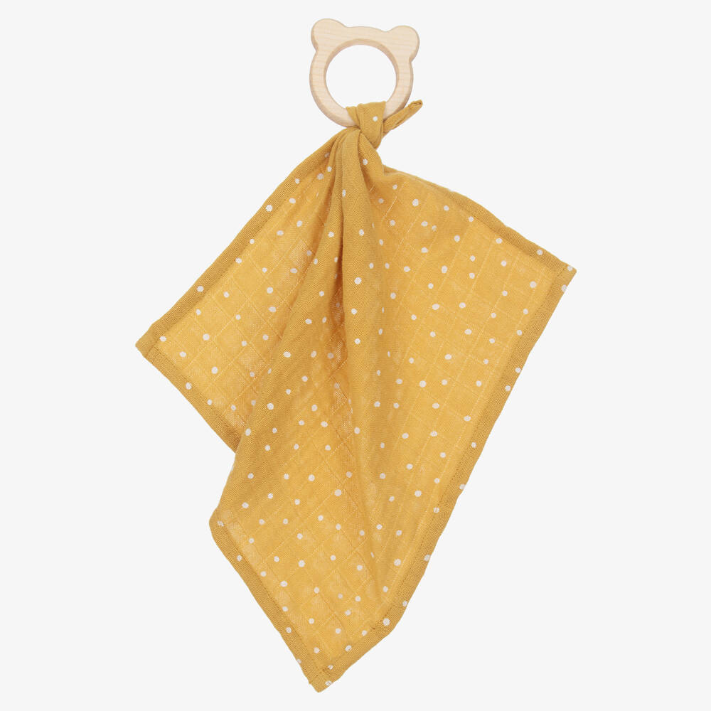 Dark yellow doudou for baby boys and girls by Danish designer Liewood, with a cute wooden bear teether in one corner. This lovely comforter is made in soft organic cotton muslin with a white polka dot pattern, and the maple wood teething ring is conditioned with jojoba oil which is safe for babies.