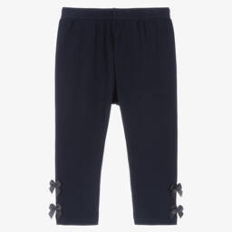 Black cotton leggings for girls by Lili Gaufrette, made in soft, comfortable jersey. Great for everyday wear, they have a gently elasticated waistband and pretty satin bow trims on the legs. Curly-edged cuffs and a small gold-tone logo charm sewn on one side complete the look.