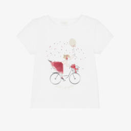 A super sweet pale pink T-shirt for girls by Lili Gaufrette, made in soft, comfortable cotton jersey. This casual tee features a girl on a bicycle graphic on the front with glittery gold and pink star details. Her red tutu skirt is trimmed with tulle for a 3D effect, adding a playful touch. A sparkling gold script logo on both the front and back adds a finishing designer touch.