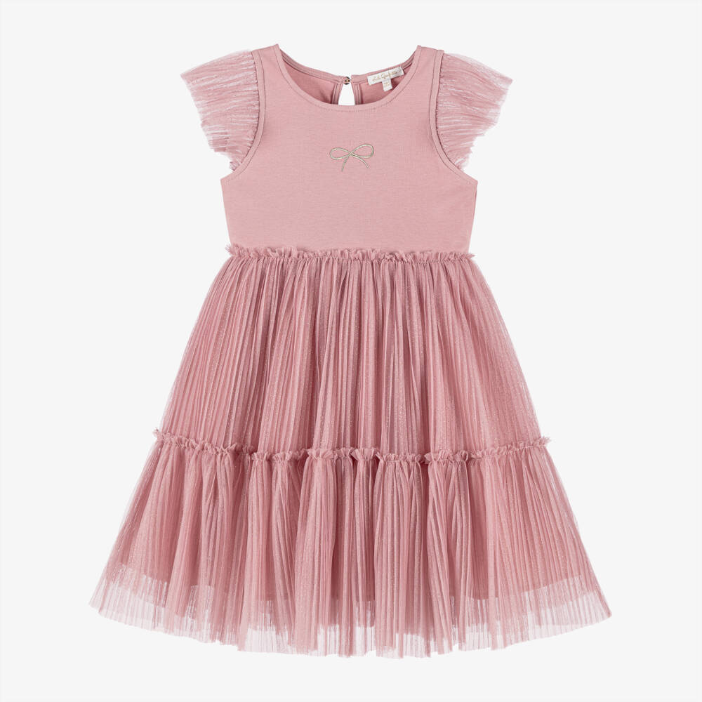 Girls pink dress by Lili Gaufrette features a charming cotton bodice with delicate tulle skirt. The soft pink hue complements the gentle pleats and flutter sleeves, creating an elegant silhouette. This dress offers comfort and style, ideal for twirling and dancing at a special ocassion.