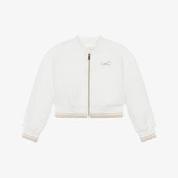 Gorgeous pastel pink bomber jacket for girls by stylish Parisian designer Lili Gaufrette, adding a little glamour to the every day. Made in sumptuous satin, it sparkles with diamantés that catch the light beautifully, and has the label's script logo and signature bow embroidered on one side in gold thread. With useful pockets on the front, it has a full, silky lining for comfort.