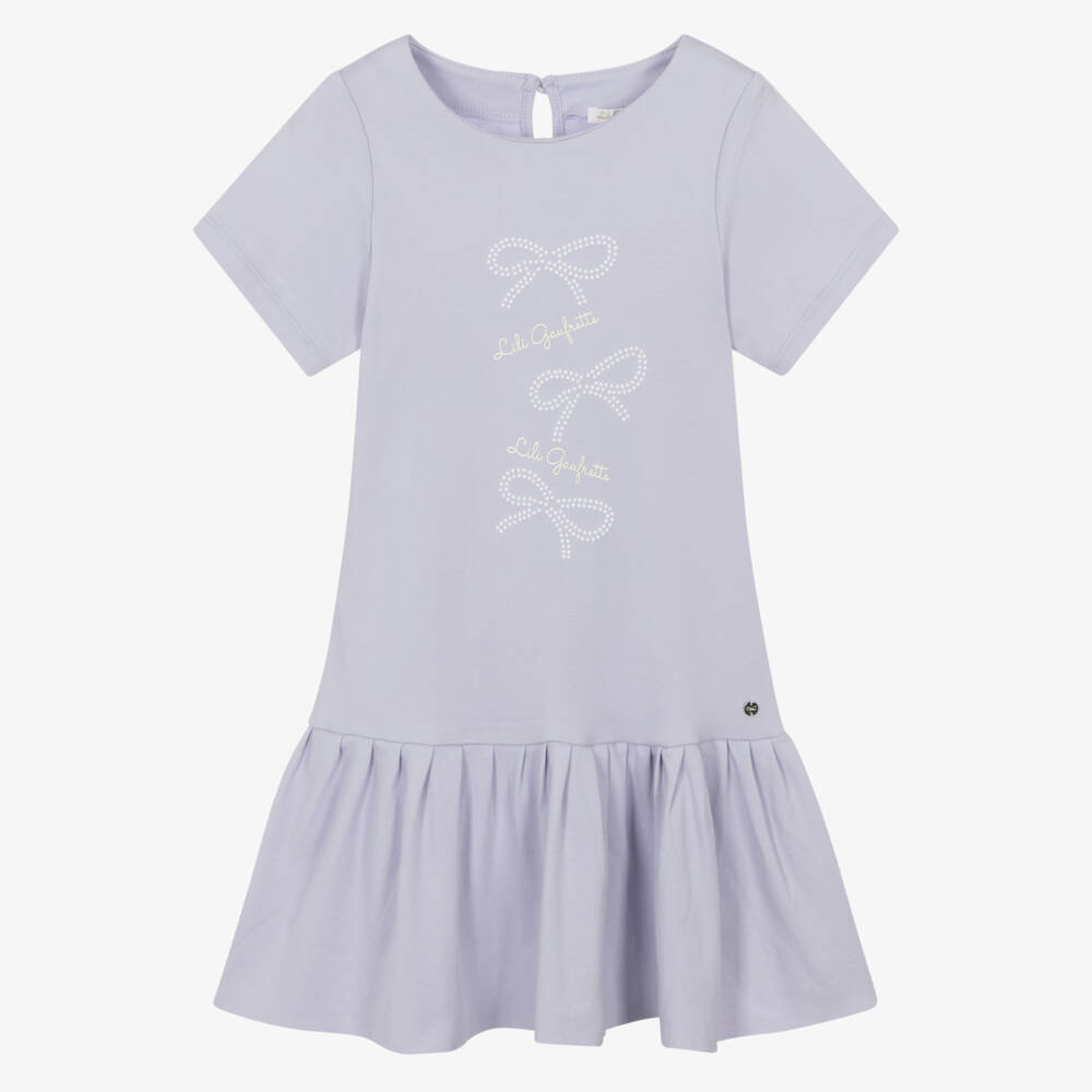 Lilac purple dress for girls by Lili Gaufrette, made in soft cotton jersey. For signature branding, it has lovely beaded bows on the front with metallic gold lettering in between. The low-waisted dress, with a gently flared skirt, is simply finished with a keyhole button fastening on the back of the neck.