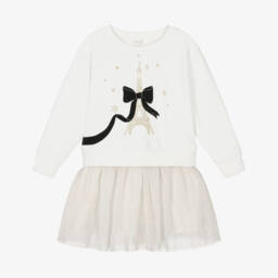 Lilac purple dress for girls by Lili Gaufrette, made in soft cotton jersey. For signature branding, it has lovely beaded bows on the front with metallic gold lettering in between. The low-waisted dress, with a gently flared skirt, is simply finished with a keyhole button fastening on the back of the neck.