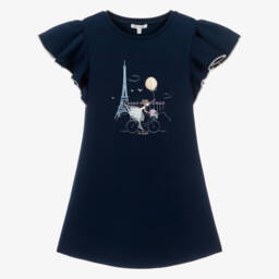 Lilac purple dress for girls by Lili Gaufrette, made in soft cotton jersey. For signature branding, it has lovely beaded bows on the front with metallic gold lettering in between. The low-waisted dress, with a gently flared skirt, is simply finished with a keyhole button fastening on the back of the neck.