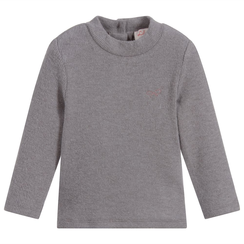 Younger girls grey ribbed top by Lili Gaufrette, made in super soft angora blend jersey. It has the designer's pink bow logo embroidered on the chest.