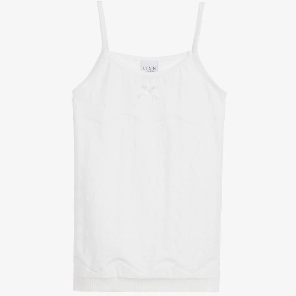 Made in a soft fine knit, this traditional girls vest by Linn, is made in natural cotton. Designed and made Spain, the fabric is super smooth and comfortable to wear against the skin. The fabric has a pin-hole pattern and a stretchy ribbed hem.