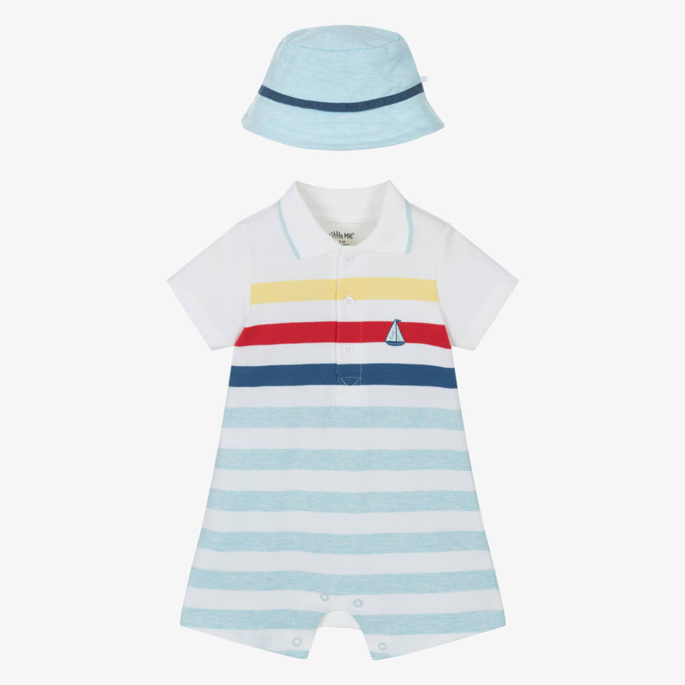Blue & white striped shortie set for baby boys by Little Me, made in soft cotton piqué. The polo style shortie features multicoloured stripes, with a classic ribbed collar and button fastenings on the front. There is a charming embroidered sailboat on the chest for a sweet nautical theme. Completing this cute outfit is a blue sun hat, which is lined in soft jersey for comfort.