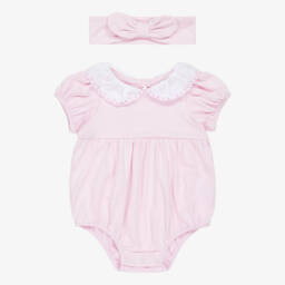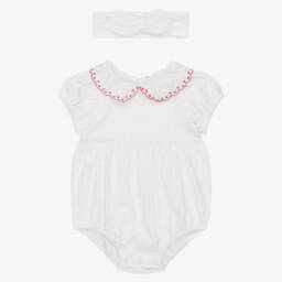 White shortie for baby girls by Little Me, made in a soft and stretchy bamboo and cotton blend. Both comfortable and charming, the shortie has a sweet pink embroidered trim on the collar. There are popper fastenings between the legs for easy dressing. A coordinating elasticated headband with a bow completes the look.