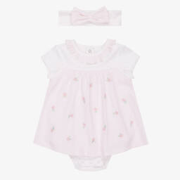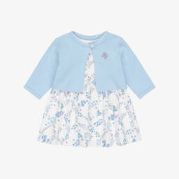 Delightful yellow & white dress set for baby girls by Little Me, made in soft cotton jersey, with a pretty yellow and blue floral pattern. The dress has a shirred bodice and is elasticated around the neck and cuffs for comfortable wear. There are matching knickers and a lovely bolero cardigan with a single button fastening to complete this charming outfit.