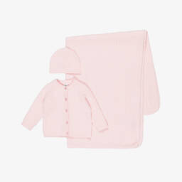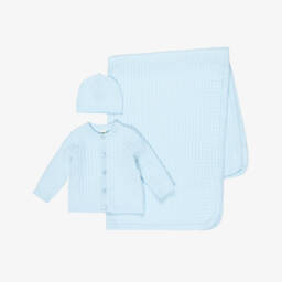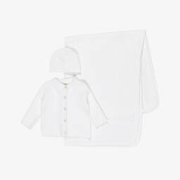 This delightful white cardigan set for baby boys and girls by Little Me is knitted in soft cotton with a cosy cable pattern. It contains a charming cardigan with branded button fastenings and a matching hat. The set is complete with a lovely blanket, ideal for keeping baby snug and warm when out and about in the pram or stroller.